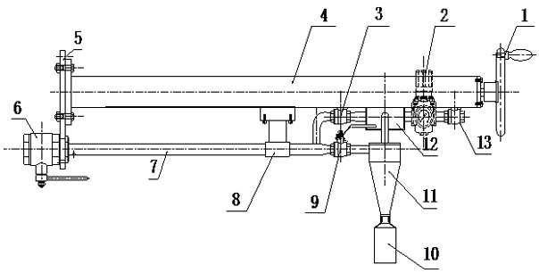 1、手輪;2、壓縮空氣調(diào)壓閥;3、球閥;4、傳動(dòng)管;5、板;6、球閥;7、取樣管;8、連接裝置;9、球閥;10、取樣瓶;11、旋風(fēng)分離器;12、射氣抽氣器;13、球閥
