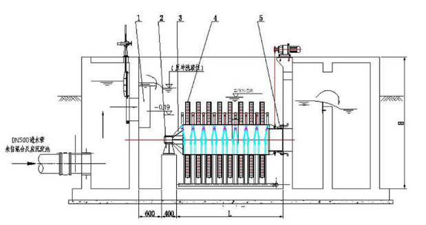 (3)排泥:纖維轉(zhuǎn)盤過濾器轉(zhuǎn)盤下設(shè)有斗型池底,有利于池底污泥收集。池底污泥沉積減少了濾布上的污泥量,可延長(zhǎng)過濾時(shí)間,減少反沖洗水量。經(jīng)過一設(shè)定的時(shí)間段,控制盤啟動(dòng)排泥泵,通過池底穿孔排泥管、閥、泵將污泥排至污泥系統(tǒng)。其中,排泥間隔時(shí)間及排泥歷時(shí)可以調(diào)整。